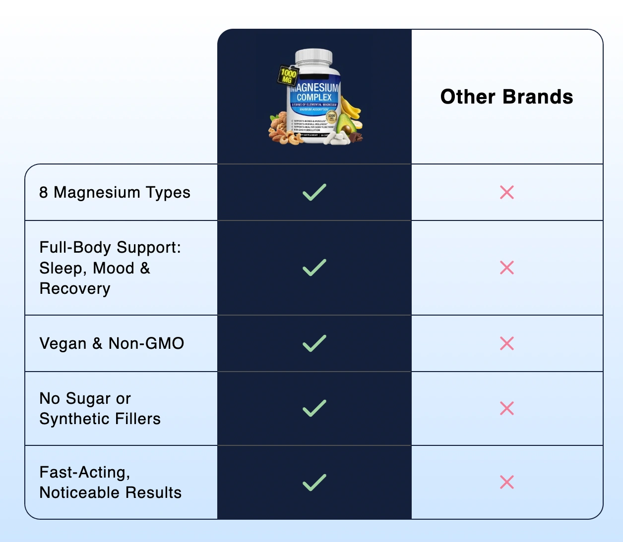 Unlike basic supplements, ours includes 8 highly bioavailable forms of magnesium—each chosen for its unique role in supporting sleep, stress relief, muscle recovery, energy, and more.